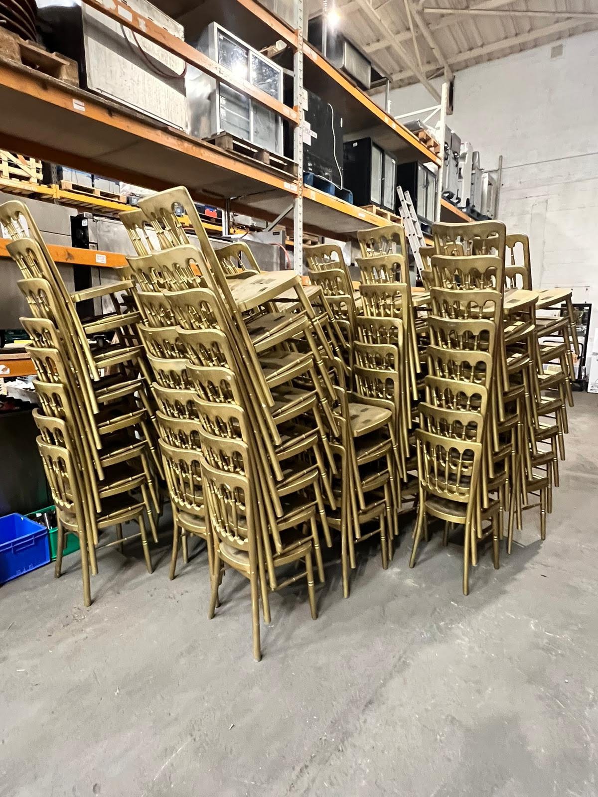 X100 gold cheltenham banquet chairs with seat pads.Price is for x100 (Job lot)