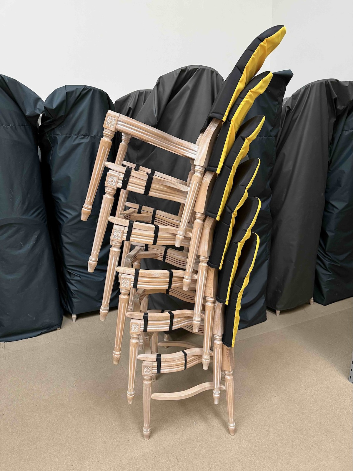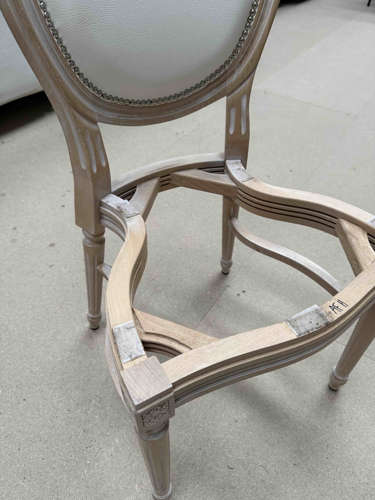 A batch of 180x Louis Chairs.Limewash frames and white faux leather upholstery.