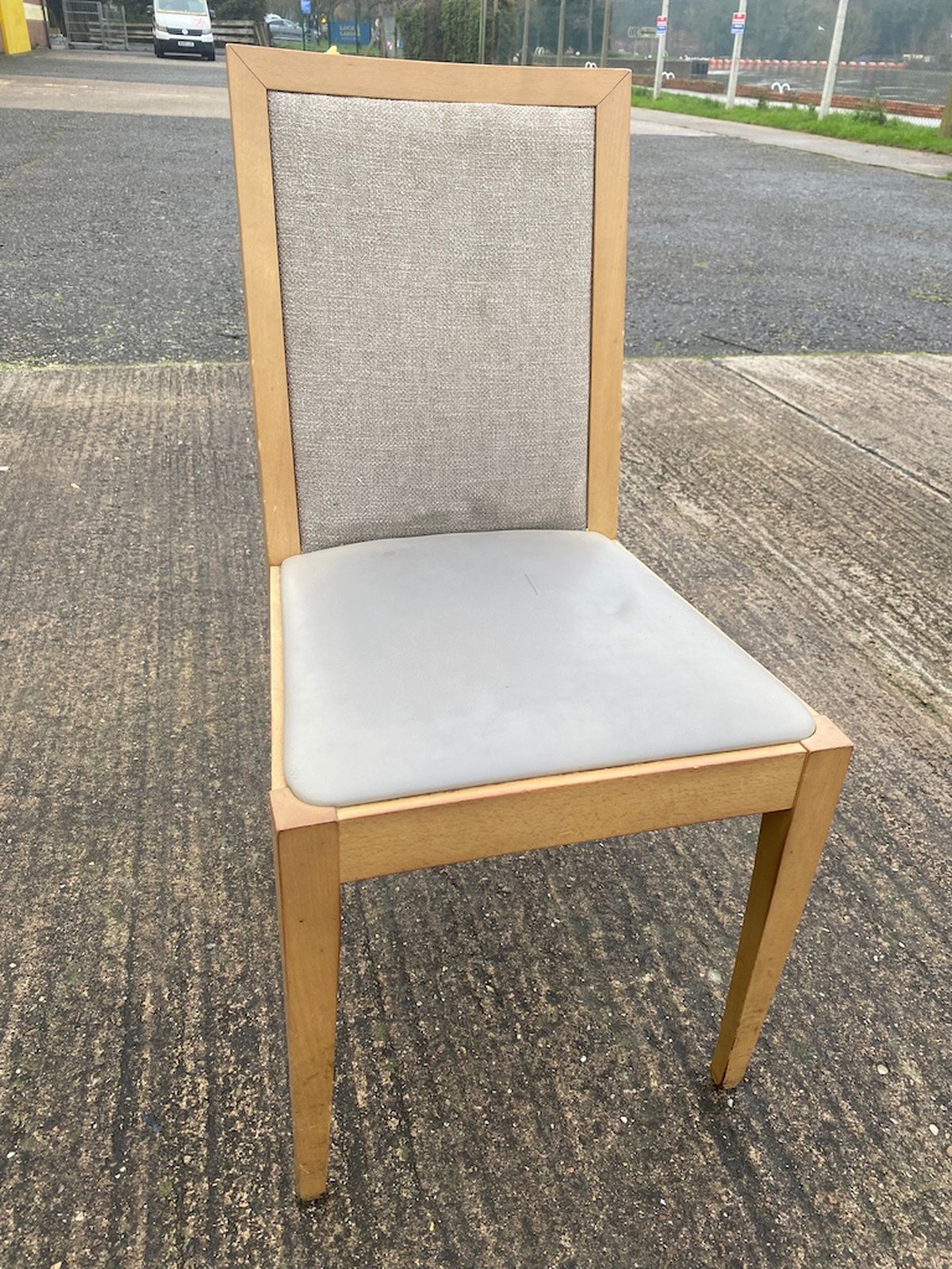 20 used dining chairs with Natural lacquer frames, Cream faux leather seats and patterned fabric backs. Supplied structurally sound with no rips or tears to the upholstery.They measure: