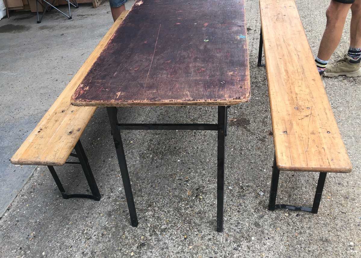 Tables and Benches for sale -The tables and some of the benches are plywood tops and steel frame (1.8m), the rest of the benches are solid pine 2m long more like german bierkeller benches, been very well used and loved, viewing recommended.