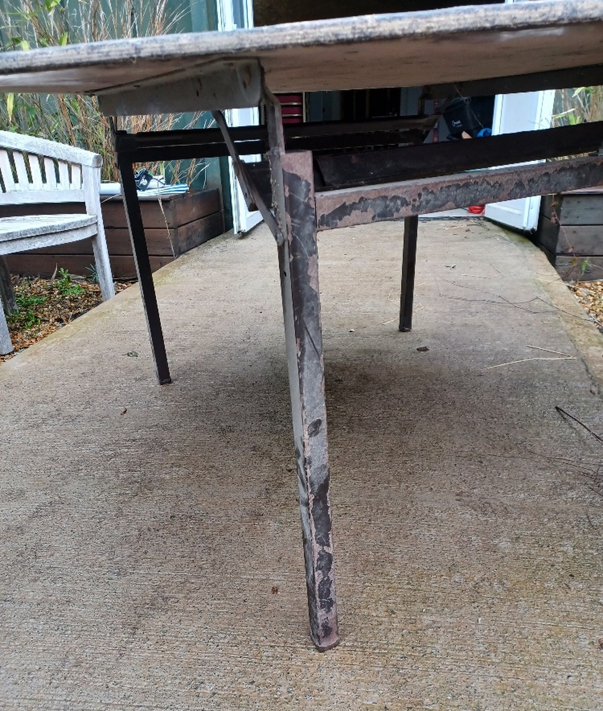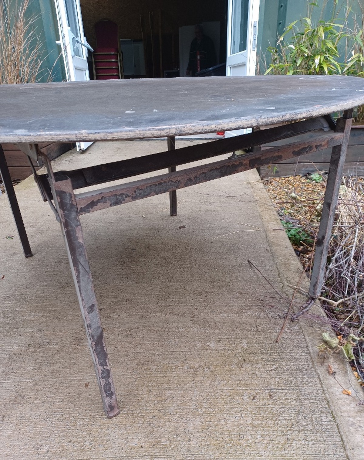The tables are well used, with wooden tops and metal frames.The frames all fold up, once covered with a cloth they are perfectly serviceable.