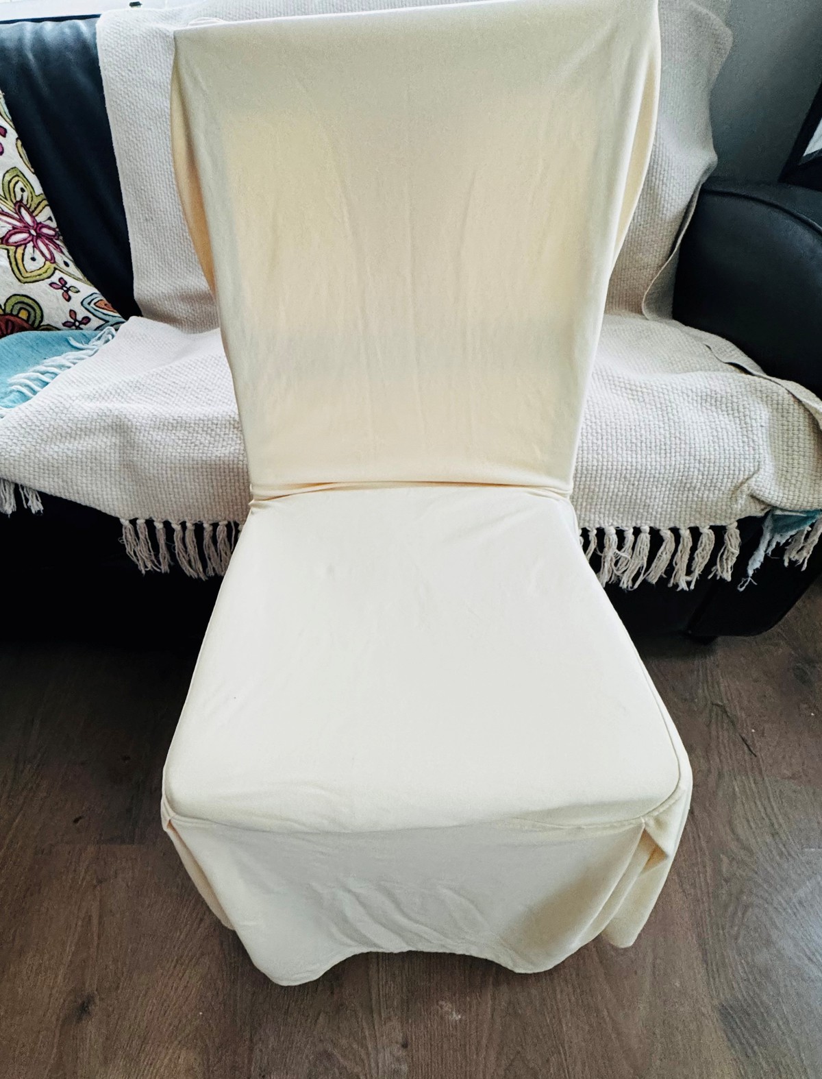 32 Cream Chair covers. (Not Lycra) Velcro to adjust at the back and tie.31 White organza sashes.