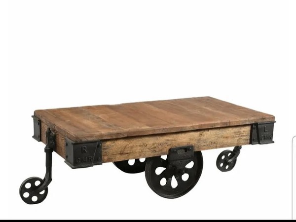 Industrial wooden trolly coffee tableComes with cast iron wheels