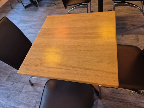 9x Hard wood tables 600mm x 600mm15x Chairs all in good condition.